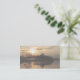 Morgonsolen silhouettes träd och exponerar lappar av dimma. Sjön reflekterar himmlen.