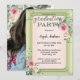 Inbjudan till studentfest av elegant med ett eget foto med ett vattenfärgsöverlägg av ro på baksidan. På framsidan visas anpassningsbarnas text med en grönt skriptrubrik (valfritt) på en rosa med låg grönt med vattenfärg ro.