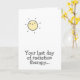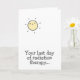 NewParkLane - Tillsätt lite positiva vibrationer med detta söta kort för den som kämpar mot cancer och behöver lite solsken Kortet har en söt liten solkartong och texten: "Din sista dag med strålbehandling!" i en rolig handstils typografi. Det medföljande meddelandet säger "Håll ut", men kan enkelt ändras till valfritt meddelande för en personlig design.