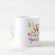 Denna roliga regnbågekaffemugg presenterar vänskapcitationstecknet, "som din vibe tilldrar din stam" på en sida av muggen.