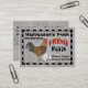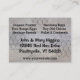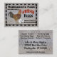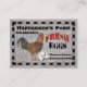 En lantlig design med en bild av en höna till vänster med hönsnät bakom den, sju vackra vita ägg under den svarta och röda texten "FARM FRESH EGGS". Det finns en svart rutig kant runt utsidan, allt på en väderbiten träskiva. Personalisera framsidan och baksidan av dessa färska ägg, visitkort för hönsgård med ditt gårdsnamn, telefonnummer och öppettider på framsidan av kortet och ditt namn, adress, webbplats och valfria ord på baksidan.