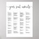 Bröllop-gästdiagram med klassiska svarta och vita funktioner "din sittplats väntar" överst i den handskrivna kalligrafskriptbokstaven, med dina gästuppdrag i bord under, ordnade alfabetiskt över fyra kolumner.