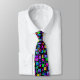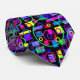 Färgad fyrkanter och cirklar på svart slips. Titta också på skon: