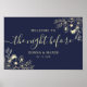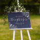 Sätt tonen för en elegant kväll med detta stilrena välkomstskylt för repetitionsmiddagen. Med diskreta gyllene blomaccent och graciös script på en rik marinblå bakgrund är denna personliga affisch perfekt för er ”kväll före”-firande.