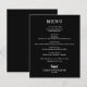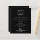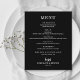 Ett matbord på svarta har en vit chic på menyn. Perfekt för en modern bröllopsdag, bröllop-repetitionsmiddag, årsdag party eller speciella evenemang med en sittande middag. Välj NÅGON BAKGRUND FÖR FÄRG, valfri FÄRG-TEXT, valfritt TECKENSNITT! Anpassa enkelt till din middagsmeny och information.