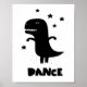 Skandinavisk stil affisch med dinosaurie som dansar. Svart-vit barntryck.