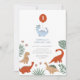 Dinosaur 1st Birthday Party Investigation har en pastellblå dinosauer som håller en röd ballong med nummer 1 inuti ballongen i en färgstark, roligt dinosauris temainställning. Anpassa den med information om ditt barns ålder, namn och party.