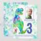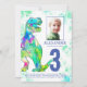 Färgglad dinosaurie-födelsedagsinbjudan för 3-årsdag med fotomall för pojken som fyller tre och älskar dinosaurier. Denna rytande T-Rex inbjuder dinosaurie-fans till en rolig 3-års fest. Anpassa denna färgglada vattenfärgssprutande blå och gröna inbjudan för tredje födelsedagen med ett foto av födelsedagsbarnet eller -flickan, födelsedagsnumret och festdetaljerna och ni är redo för en späckad dinosaurie-tematisk dino-födelsedagsfest. Alla dinosauriearter är välkomna. Vacker originalkonst av konstnären Catherine Sweetman