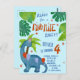 Redo för en dino-mite fest? Lägg bara till namnet på din son eller dotter och annan information och du kommer att ha ett mycket originellt kort. Sött födelsedagsinbjudan för små barn med en dinosaurie, ballonger, festhatt, gröna blad och röda stjärnor, gjort i akvarell och penna. Handritad, även handritad teckensnitt, söta retro-typografiska bokstäver. Helt anpassningsbar med namn, ålder, adress, datum, rsvp. Baksidan är med stjärnor och logotyp för studio Patruschka. Du kan också redigera hela designen.