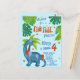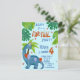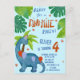 Redo för en dino-mite fest? Lägg bara till namnet på din son eller dotter och annan information och du kommer att ha ett mycket originellt kort. Sött födelsedagsinbjudan för små barn med en dinosaurie, ballonger, festhatt, gröna blad och röda stjärnor, gjort i akvarell och blyerts. Handritad, även handritad teckensnitt, söta retro-typografiska bokstäver. Helt anpassningsbart med namn, ålder, adress, datum, rsvp. Baksidan är med stjärnor och logotyp för studio Patruschka. Du kan också redigera hela designen.