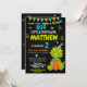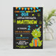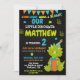 Stomp, chomp, growl and rawr with this fun dinosaur birthday invitation! Features cute green T-Rex with party hat, chalkboard background with bright colors and dinosaur footprints. Perfect for boys or girls dino-themed birthday parties. Playful design with bunting and paw prints. Great for kids who love dinosaurs, T-Rex, and prehistoric adventures. Create a roaring good time for your little dinosaur's special day!