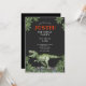 En dinosauriepojke i födelsedagsfest inbjudan med en dinosauriepromenad omgiven av primeval handflatan löv. En scen från tidens början, med färgadens typografi i gröntens rött och vitt mot svart bakgrund. Svarta på baksidan av inbjudan.