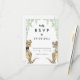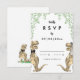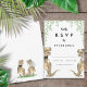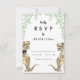 Rolig dinosaurie-tema vigsel-svarskort med rolig dinosaurie-brud och -brudgum med akvarell botanisk lövmönster för att ge förhistorisk jurassisk glädje på din vigseldag. Modernt fantasifullt typografi kalligrafi med lättanpassade mallar. Unika T-Rex-brud och -brudgum i brunt och akvarellgrönt eukalyptusgrönska originalkonst av konstnären Catherine Sweetman Perfekt för mottagningen eller repetitionen middagen på vigseldagen. Matchande vigselpaket innehåller allt du behöver på din roliga vigselresa