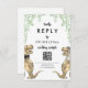 Roligt Dinosaur Temed bröllop OSA QR Code-webbplatssvarskort med lustigt dinosauriebrid och eucalyptus greenery i groom och vattenfärg för att ge din bröllopsdag förhistorisk Jurassic glädje. Modern kalligrafi för visuell typografi med enkel att anpassa mallar så att du kan lägga till QR-kod och webbläsarens webben adress och användbara gästinstruktioner för bröllop. Unik T-Rex-brud och groom-dino med vattenfärg botaniskt bladverk originalkonstverk av konstnären Catherine Sweetman Ideal för bröllopsdagens mottagning eller repetitionsmiddag. Matchande bröllop-svit innehåller allt du behöver på resan roligt bröllop