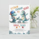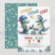 En inbjudan till två roligtar och en söt födelsedagspartier, med ett dinosaurietema och titeln Stomp Chomp & Roar, med en vattenfärgad illustration av två vidlyftiga dinosaurier med headset och en bra-dans. Fira dina vilder med den här häpnadsväckande roliga inbjudan som kommer att ange tonen för en vild.