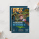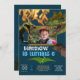 En cool, rolig och modern design med rytande tyrannosaurier t-rex förhistoriska djur och en flygande pterodaktyl omgiven av glödande heta röda flammor och slitna text i svart, blå och orange mot en mörkblå bakgrund. Dinosaurierna visar sina stora tänder och både framsida och baksida kan anpassas. Anpassa fotografiet med en bild av födelsedagspojken. Perfekt för din son som firar en födelsedag med dino-tema.
