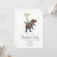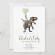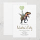 En inbjudan till hjärtansdagsfest med en illustration av en T rex-dinosaur som håller i en grön ballong i hjärtform.