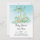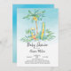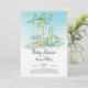 Modern Hatching baby dinosauer med mamma och handflatan träd har en blå vattenfärgsbakgrund. Vänd vår trevliga duschinbjudan om du vill visa en koordinerande återgång