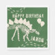Stegosaurus är redo till party! Dinosaur skelett med ballonger och fotavtryck personlig födelsedagskalkylsservetter med anpassade namn och bakgrundslägenskap färg.