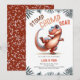 En roligt och en söt födelsedagsbjudande för barn med ett dinosauritema, med en vattenfärgad illustration av en dinosaur i en coola dansrörelse och ett terracotta-, grått- och svart färg-schema. Fira din lilla vild med den här magen, chomp och roar inbjudan som kommer att ange tonen för en vild i den förhistoriska djungeln.