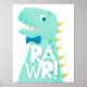 Sött design för ditt barnkammardesign eller dekorationer i barnrummet. Det finns en illustration av en grön dinosaurie med gula taggar, blå fluga och ett leende på hans ansikte. På hans mage står det "RAWR!" i rolig typografi. Perfekt för babypojkar och barn.