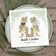 Överraska dina gäster med dessa roliga dinosaurie-tema anpassade bröllopsservetter med rolig dinosauriebrud och -brudgum samt vattenfärgseukalyptusblad. Lätt att anpassa med brudens och brudgummens namn, bröllopsdatum i modern typsnittskrift. Roliga T-Rex brud och brudgum illustrationer i bruna nyanser med vattenfärg botanisk grönska i gröna nyanser. Unik original dino-konst av konstnären Catherine Sweetman