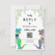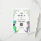 Dinosaur-tema bröllop RSVP online QR-kod webbplats svarsbrev med rolig dinosauriebrud och -brudgum med akvarell eukalyptusblad för att ge förhistorisk jurassisk glädje till din bröllopsdag. Modernt fantasifull typografi med lättanpassade mallar så att du kan lägga till bröllopswebbplatsens QR-kod och webbadress och hjälpsamma instruktioner för gästerna. Unik funky psykedelisk T-Rex brud och brudgum med akvarell botanisk grönska originalkonst av konstnären Catherine Sweetman Perfekt för bröllopsmottagningen eller repetitionen middag. Matchande bröllopssvit innehåller allt du behöver på din roliga bröllopsresa