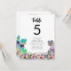 Denna roliga T-Rex brud och brudgum i en förhistorisk färgrik äng med vilda blommor dinosaurie-tematisk bröllopsbord placeringskarta kommer att glädja dina gäster och ge dino-förnöjelse till ditt bröllop. Gör det enkelt för dina bröllopsgäster att hitta sin plats i Jurassic dinosauriebröllopsstil. Lägg bara till bordnumret och gästnamnen för varje bord med hjälp av de enkla mallarna för att skapa ett dubbelsidigt bordnummerdiagram som du kan fästa på en linje eller ha på en bordshållare. Färgrik Tyrannosaurus rex och äng med vilda blommor i akrylfärg i gröna, blå, lila, rosa, gula, orange, burgunder och turkosa nyanser. Originalkonst av konstnären Catherine Sweet