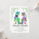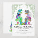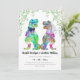 Gläd dina gäster med denna roliga färgglada psykedeliska dinosaurie-inspirerade bröllopsinbjudan med rolig dinosauriebrud och -brudgum samt akvarellbladverk. Lätt att anpassa med brudens och brudgummens namn, bröllopsdatum och alla detaljer om bröllopsplatsen i modern typsnittsstil. Roliga illustrationer av T-Rex-brud och -brudgum i rosa lila blå grön gul och orange nyanser med eukalyptusgrönska. Unik original-dinosauriekonst av konstnären Catherine Sweetman