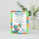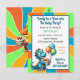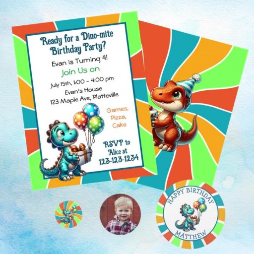 Söta personliga födelsedagsinbjudningar för pojkar. Sött dinosaurietema i blått, orange och grönt. Söta tecknade dinosaurier som håller ballonger och födelsedagstårta.