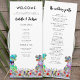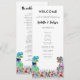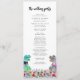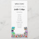 Roligt dinosaurie-tema bröllopsdagsprogram med färgglad T-Rex brud och brudgumme i en vacker förhistorisk äng med vilda blommor. Lätt att anpassa med brudens och brudgummens namn, bröllopsdatum och alla detaljer om bröllopsdagens ceremoni i modern typsnittsstil. Roliga Tyrannosaurus Rex brud och brudgumme dino och akvarell-illustrationer av vilda blommor i blå rosa lila orange gul röd och grön nyans. Unik originaldinosaurie- och blomsterkonst av konstnären Catherine Sweetman