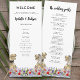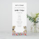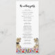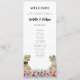 Lustigt med dinosauris temaprogram bröllopsdag med dinosauribrud och trimning i en färglös förhistorisk ängsskugga för vilda blommor. Enkel att anpassa med bruden och rummen namn, bröllop-datumet och alla detaljer om bröllopsdagens ceremoni i moderna typografiskript. Roligt T- Rex-illustrationer för ljussken och trimning av dino- och vattenfärgsblommor i röd gult för blå rosa lila orange och nyans för grönt. Unik originalteckning av dinosaurer och blommigtar av konstnären Catherine Sweetman