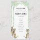 Lönsamt dinosauris temaprogram för bröllopsdag med roligt dinosauribrud samt eucalyptus foliage i groom och vattenfärg. Enkel att anpassa med bruden och rummen namn, bröllop-datumet och alla detaljer om bröllopsdagens ceremoni i moderna typografiskript. T-Rex-brud- och groomdinoillustrationer i bruna nyanser och vattenfärgat botaniskt grönt i nyanser av grönt. Unikt originalverk av konstnären Catherine Sweetman