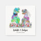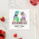 Roligt dinosaurie-tema bröllop med dinosauriebrud och -brudgumme i en vacker färgrik äng med vilda blommor, en anpassad dinosauriebröllopsservett för att glädja dina gäster. Lätt att anpassa med brudens och brudgummens namn och bröllopsdatum i modern typsnittsstil. Roliga Tyrannosaurus Rex-brud och -brudgumme och akvarell sommarblommor illustrationer i lila, blå, rosa, gröna, gula och orangea nyanser. Unik original dino- och sommarblommig konst av konstnären Catherine Sweetman