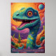 Viktiga och livfulla dinosaurier som verkar vara en blandning av fantasi och förhistorisk charm. Dinosauren har ett långt nacke och stort huvud, med ett vidsynt uttryck med fängslande, överdimensionerat ögon att ge är ett sött och nyfiket utseende. Dess hud är försedd med intrikat mönster som liknar färgstarka, snurrande former och prickar, nästan som om dess kropp är målad med ett kalejdoskop av struktur i blues, gröntar, gulter och lila. Den sjudande bakgrunden, med dess snurrande planeter för himmel och abstrakt, ge intryck av ett annat världslandskap, som antyder att dinosaurien finns i en surrealistisk, fantasirik värld. Den ljusa, överdrivna färg och lekfulla karaktären hos ge är en vänlig, animerad karaktär som är perfekt för en magisk eller drömliknande inställning. Denna dinosaurie skulle kunna tillhöra en tänkt art från en kosmisk sfär, där flora och fauna utvecklas i vibranta, psykoproduktiva ekosystem, där förhistoriskt liv blandas med en rymdåldersskevning. Dess gärning exuderar oskuld och , som om den för första gången utforskar sitt fantastiska universum.
