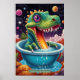 Viktiga och livfulla dinosaurier som verkar vara en blandning av fantasi och förhistorisk charm. Dinosauren har ett långt nacke och stort huvud, med ett vidsynt uttryck med fängslande, överdimensionerat ögon att ge är ett sött och nyfiket utseende. Dess hud är försedd med intrikat mönster som liknar färgstarka, snurrande former och prickar, nästan som om dess kropp är målad med ett kalejdoskop av struktur i blues, gröntar, gulter och lila. Den sjudande bakgrunden, med dess snurrande planeter för himmel och abstrakt, ge intryck av ett annat världslandskap, som antyder att dinosaurien finns i en surrealistisk, fantasirik värld. Den ljusa, överdrivna färg och lekfulla karaktären hos ge är en vänlig, animerad karaktär som är perfekt för en magisk eller drömliknande inställning. Denna dinosaurie skulle kunna tillhöra en tänkt art från en kosmisk sfär, där flora och fauna utvecklas i vibranta, psykoproduktiva ekosystem, där förhistoriskt liv blandas med en rymdåldersskevning. Dess gärning exuderar oskuld och , som om den för första gången utforskar sitt fantastiska universum.