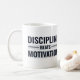 Påminn dig själv om att konsekvensen vinner med denna "Discipline Beats Motivation" mugg. Underbar för morgonkaffe, kontor eller som en tankfull gåva.
