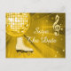 Eleganta, glamourösa femtioårsfirande / 50-årsfirande save the date vykort. Trendiga glitter och glamour save the date för din födelsedagsfest. Vacker, skinande guldglitter diamanter bling juveler musiknot bild, funky guld retro disko spegelklot och guld rullskridsko bild på en chic klassisk guld bakgrund med vita ljus och glitter. Ett sött, klassiskt, fashionabelt, snyggt, vackert save the date vykort för kvinnors födelsedagsfester. Kvinnor kommer att älska denna coola, roliga, funky, girlika design för deras glamourösa musik och dans/rullskridsko fester. Rullskridsko grafik av Lilly Bimble. Om du behöver hjälp med att anpassa din produkt, vänligen kontakta mig