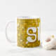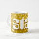 Mugg med en stiliserad roligt och funky med ett stiliserat "disco spegel tile look" som skrivs ut mönster i skuggor av gult guld och vitt, och texten i stil. Kan användas som bakgrund för din egen text, bilder och dina idéer. Observera att det här är en tryckt digitalbild, att den inte visar eller innehåller äkta spegel eller glitter.