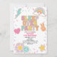 Sov över Party! Inbjudan till födelsedagskalender med regnbåge, hjärta och fredstecken.