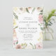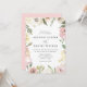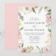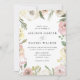 Bröllopbjudanden till blommigten i elegant som innehåller dina bröllop-uppgifter som har utformats av en gräns av ro och löv i muterade nyanser av rosa, elfenben, mauve och grönt. Den omvända sidan visningar en solid ljus rosa bakgrund. Designad att samordna med vår insamling av subtle Blooms bröllop.