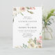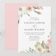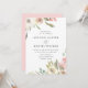 Bröllopbjudanden till blommigten i elegant med dina bröllop-detaljer parade med buketter av vattenfärgsfärgat ro och löv i muterade skuggor av rosa, elfenben, mauve och grönt i hörnen överst och grund. Den omvända sidan visningar en solid ljus rosa bakgrund. Designad att samordna med vår insamling av subtle Blooms bröllop.