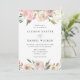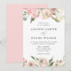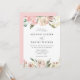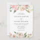 Bröllopbjudanden för blommigt i elegant med dina bröllop-uppgifter parade med översta och grund gräns av vattenfärgen ro och löv i muterade nyanser av rosa, elfenben, mauve och grönt. Den omvända sidan visningar en solid ljus rosa bakgrund. Designad att samordna med vår insamling av subtle Blooms bröllop.