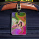 En initial design för beställnings- monogram med färgrikt virvlar runt. Ett mång- färgmönster av abstrakt vridningar, vinkar och virvlar runt, med en blek cirklar, på cirkla är ett svart beställnings- monogrambrev. Det initiala brev kan vara personligen.