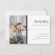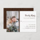 Svarskort från Rustic bröllop har ett brunträskaraktär på vitt med elegant, som matchar mörk brun manustypografi. Baksidan av kortet har också en rustik träkiv. Lägg till ditt favoritfoto för ett enkelt utseende och snyggt som matchar våra tre fotobröllopsinbjudningar.