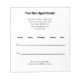 Det här anteckningsblocket säger "Din nästa Möte" överst. Linjer med text om svart visning finns tillgänglig för namn i läkarmottagningen, adress, mobilt nummer och webbplats. Det finns också linjer för datum och tidpunkt för det möte. Grund har visning som du kan redigera för att visa ett anpassningsbar-meddelande. All text kan redigeras eller tas bort.