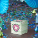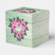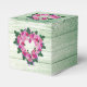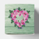 Rosa rosor i en hjärtformad krans som hänger på en trävägg målad ljust grön. En avslappnad vacker hjärtdesign som gör ett vackert tema för en bröllopsfest, bröllop, årsdag eller Alla hjärtans dag-firande.