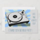 En funky, coola-, reflektor- och höftmusik i temed födelsedagsfest inbjudan lämplig för en tonårspojk med en bild av en retro vinylpostspelare mot en blå, strimlad bakgrund. Texten kan anpassas helt och hållet till dina egna personuppgifter.