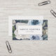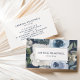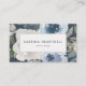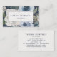 En elegant visitkortdesign med en djärv boho-vattenfärg bukett av blå och vita blommor och grön lövverk på en mörkblå bakgrund. Anpassa den med ditt namn och titel i mörkblå text på en off-white rektangel. Lägg till ditt namn, titel och kontaktuppgifter på baksidan.