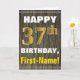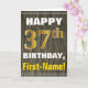 Denna enkla födelsedagskortdesignen har en varm födelsedagsönskan som "GRATTIS PÅ 37-ÅRSDAGEN, Förnamn!" på framsidan, i fet text mot en bakgrund med ett falskt trämönster. Födelsedagsnumret har en falsk guldliknande färgton. Namnet på framsidan kan anpassas. Insidan har ett anpassningsbart födelsedagsmeddelande. Ett gratulationskort som detta kan vara ett roligt sätt att leverera födelsedagsönskningar till någon som firar sin trettiosjunde födelsedag.